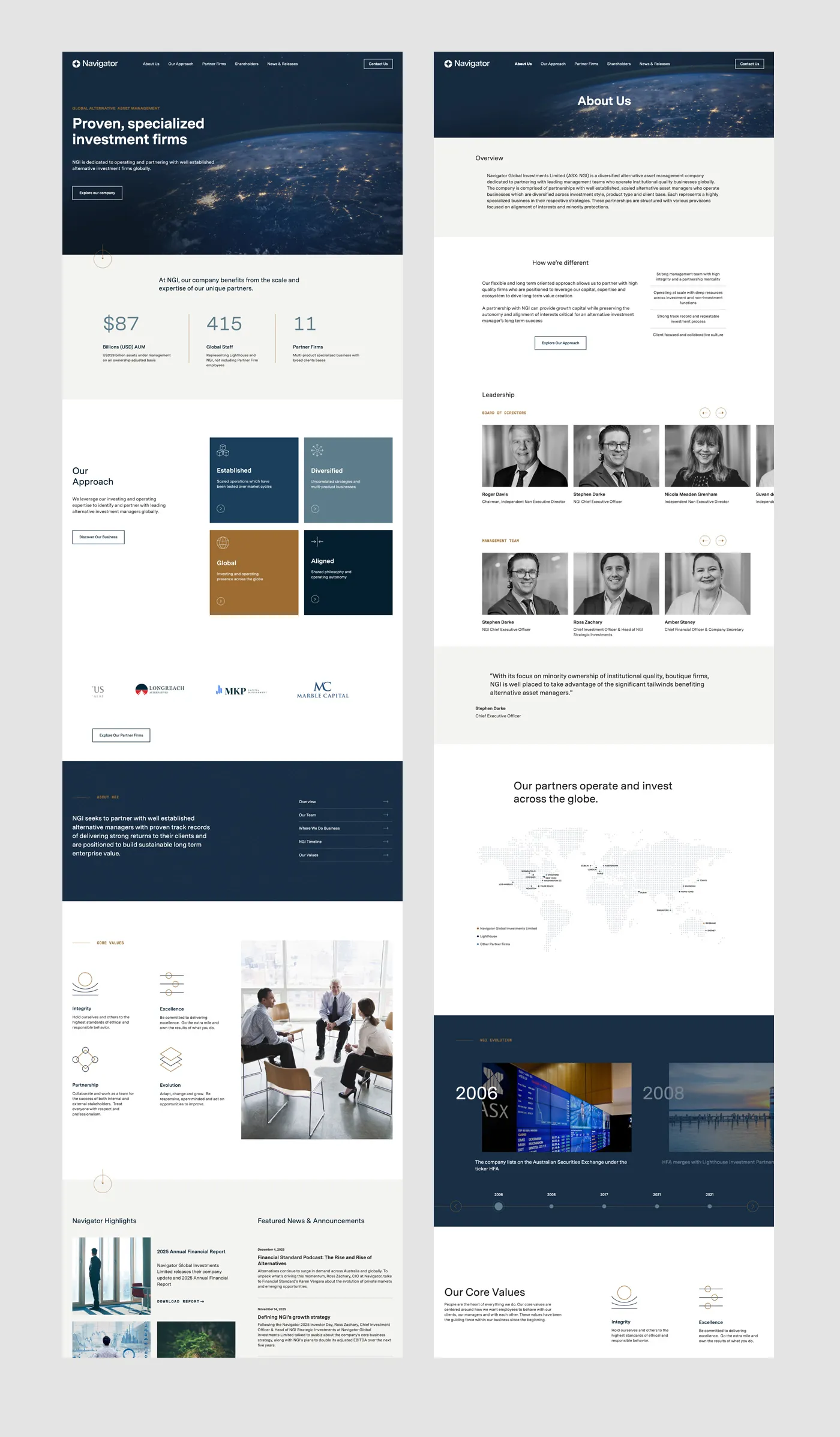 With the brand system defined, ZINC designed and built a new flagship website in Webflow. The site was structured to clearly communicate Navigator’s value proposition while supporting deeper engagement for investors and stakeholders.