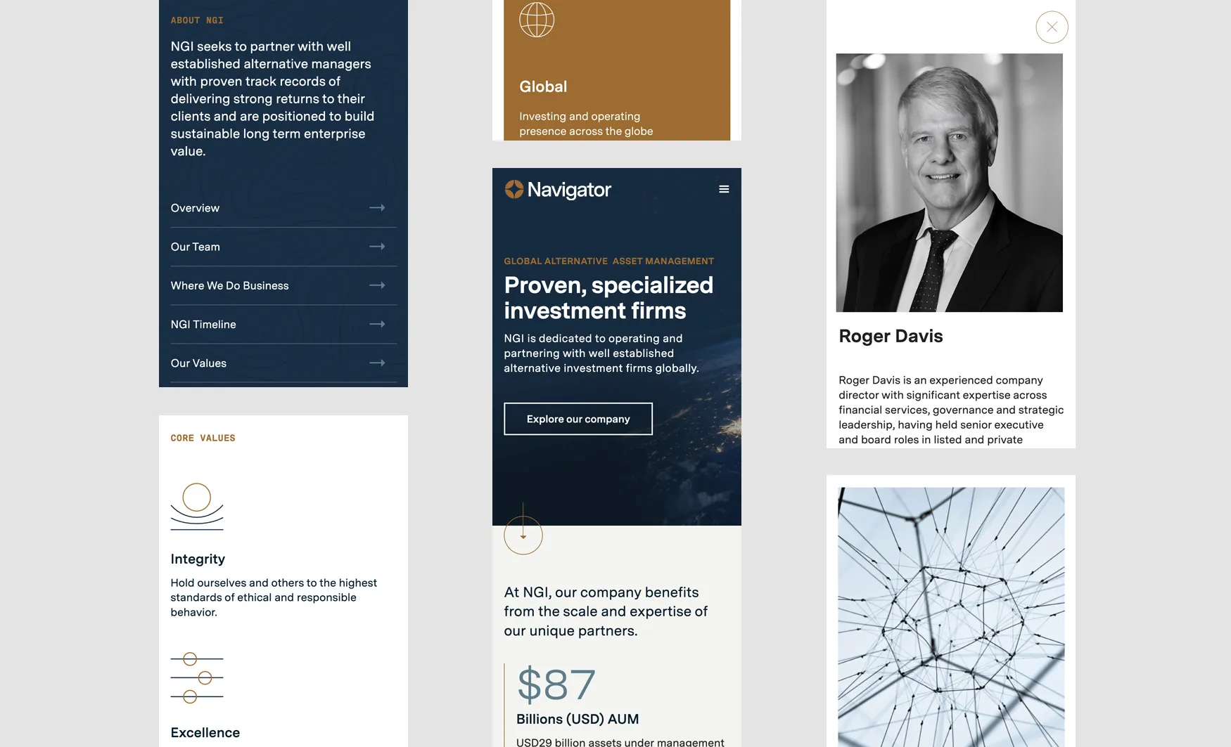 The new identity system established a distinct and confident look for Navigator Global. Clean typography, restrained color usage, and a refined mark created a sense of precision and trust, while subtle visual details added warmth and approachability.